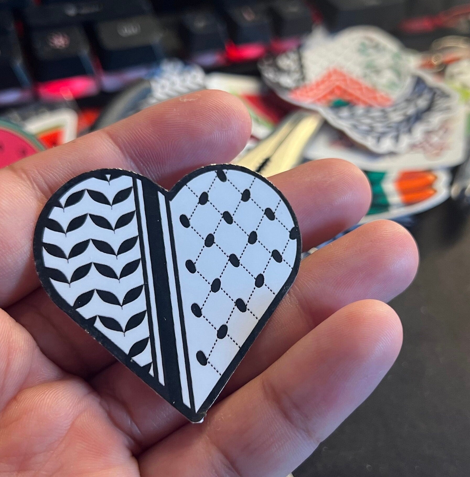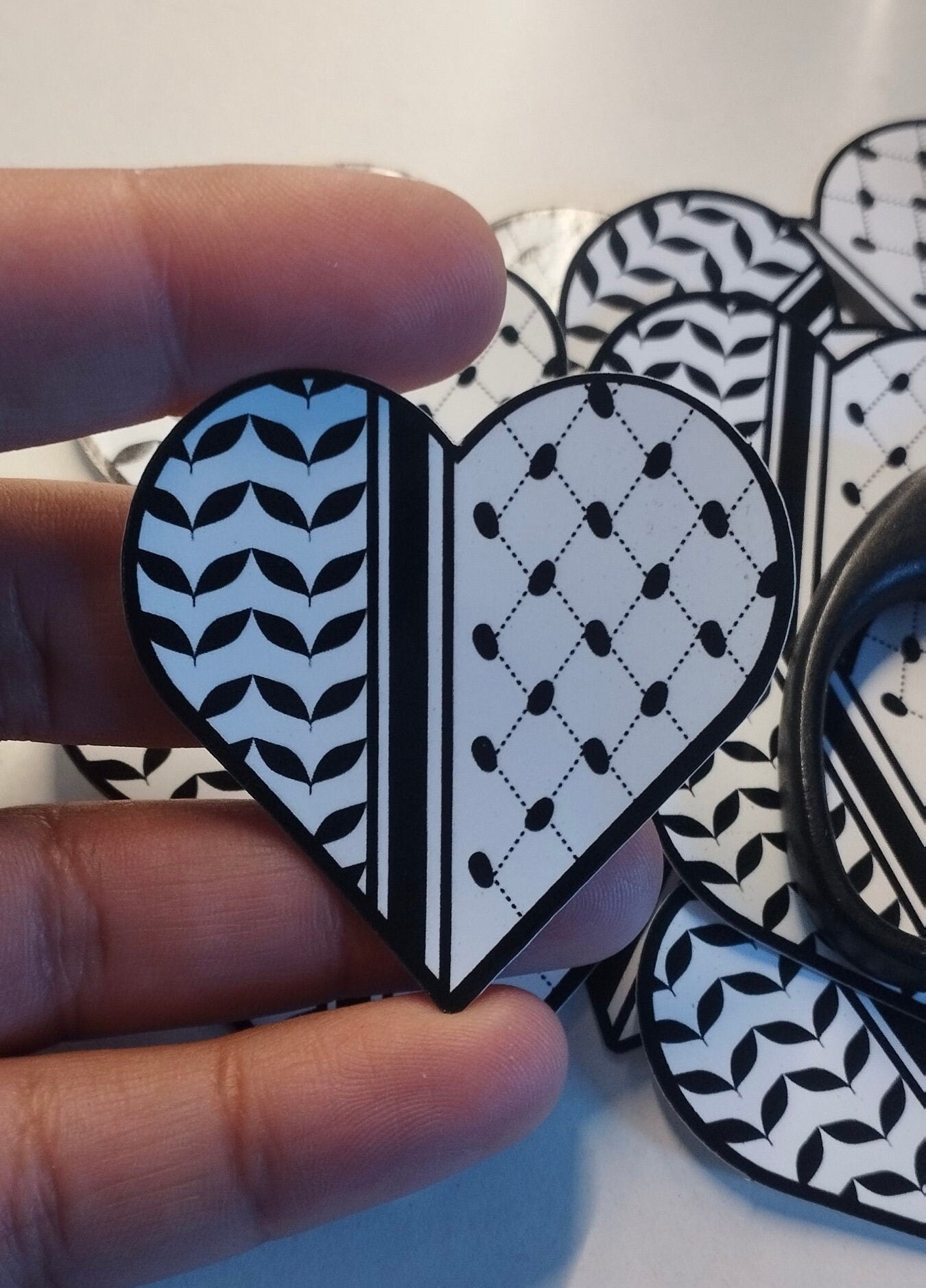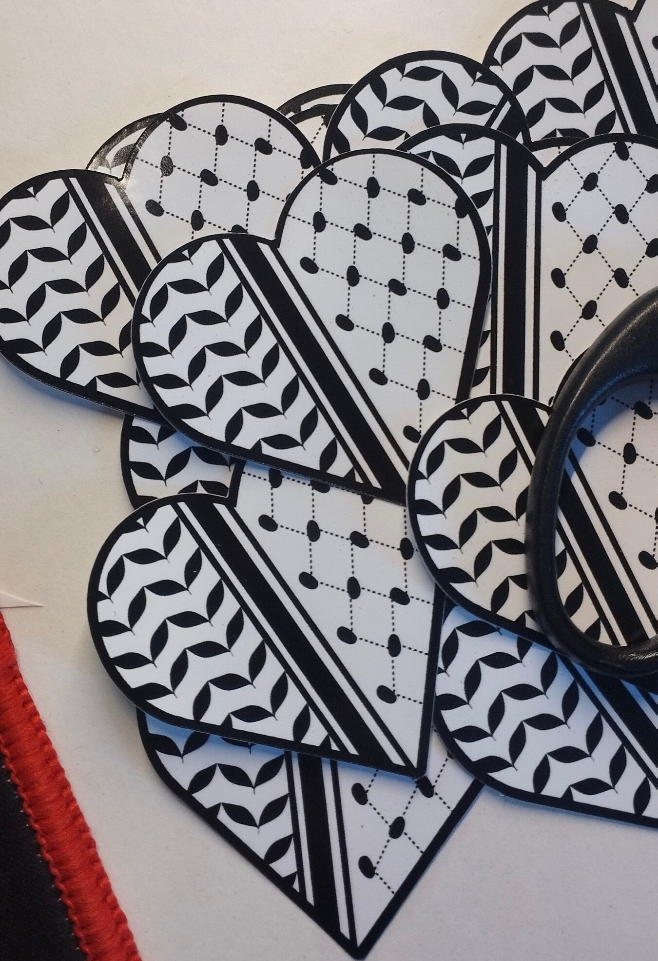 Bulk Kuffiya Vinyl Decals for Palestine Car Window Sticker in Solidarity with Gaza Patterns of the Palestinian Keffiyeh in the shape of a heart Printed on High Quality Gloss White 100 GSM Splashproof Sticker Paper Stick them on your Laptop, Phone Case, Waterbottle, Windscreen, Notebook, Pencil Case