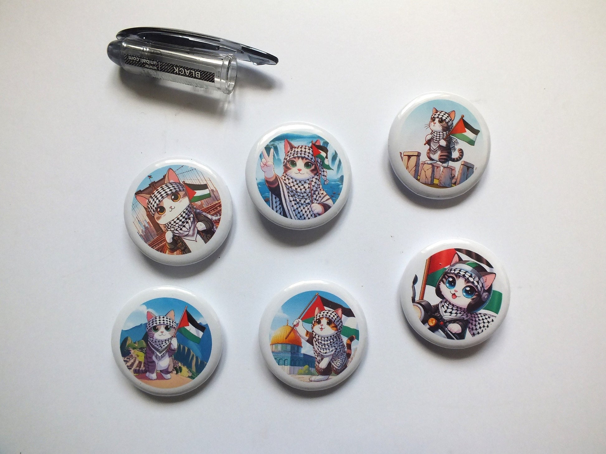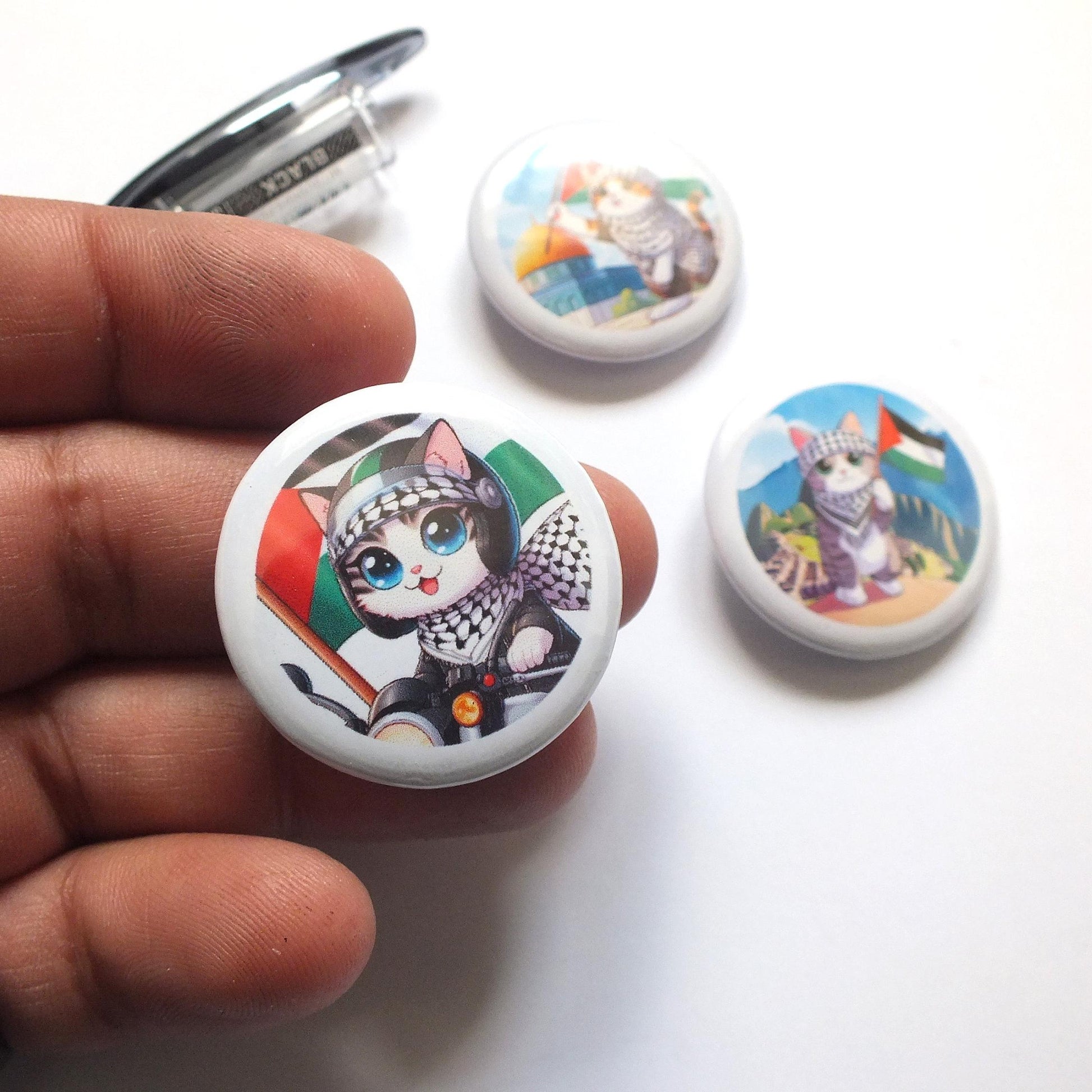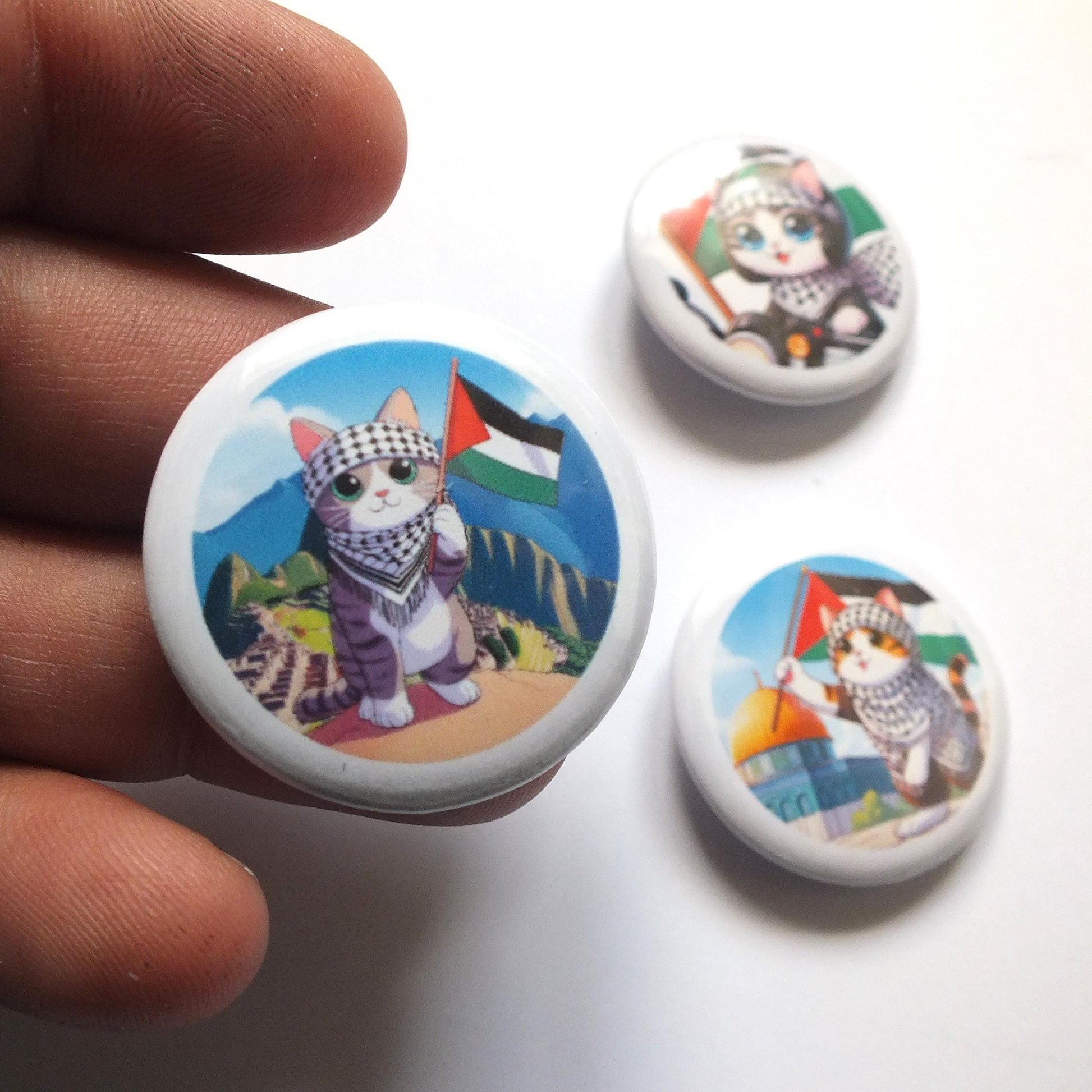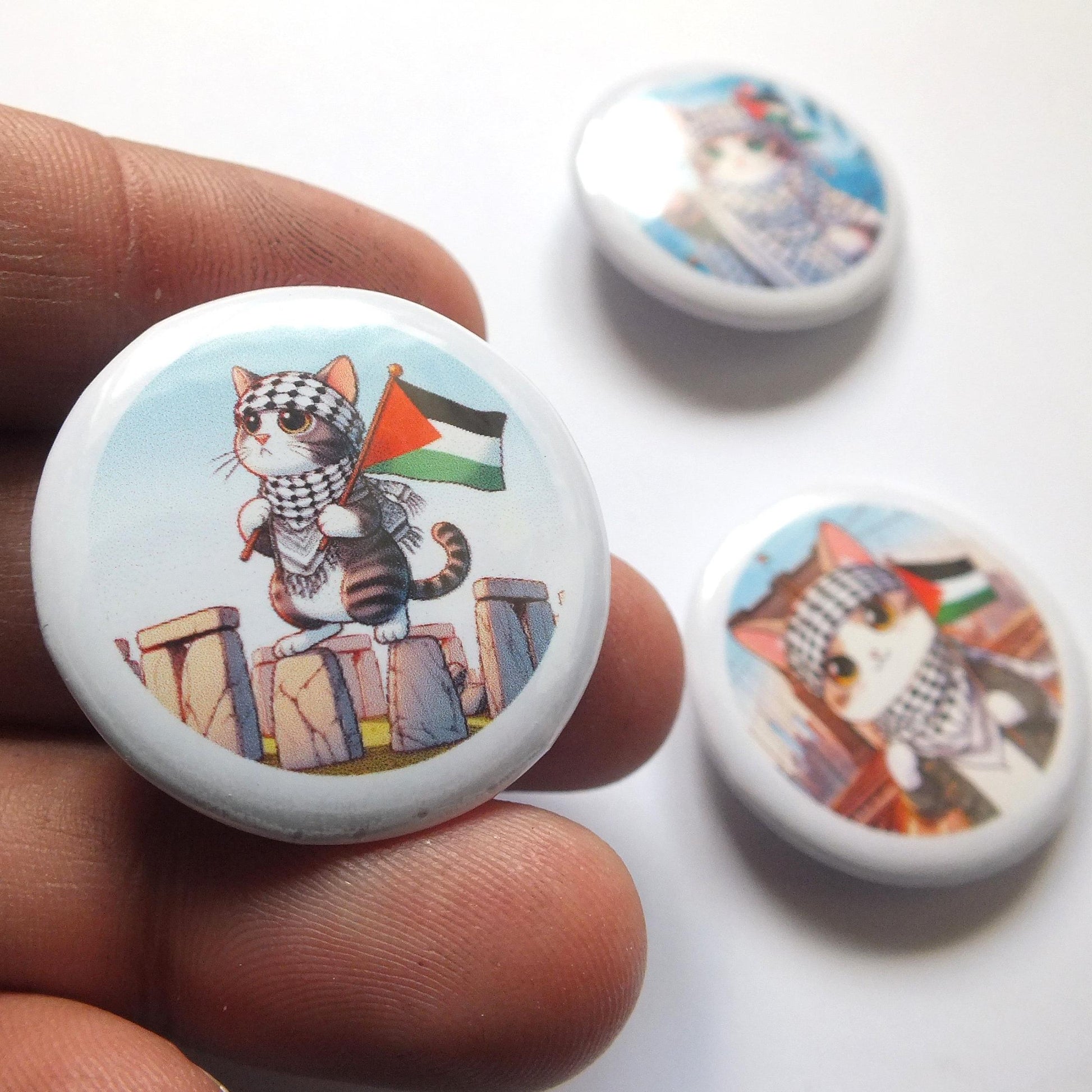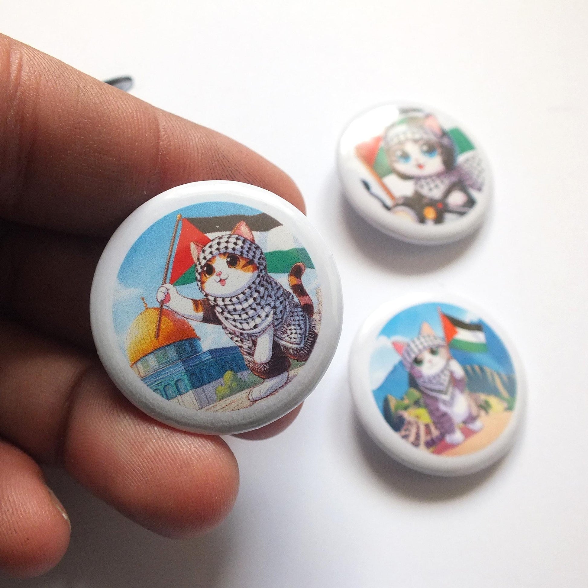 Our popular sticker designs now in the form of a Pro Palestine Cat Pin