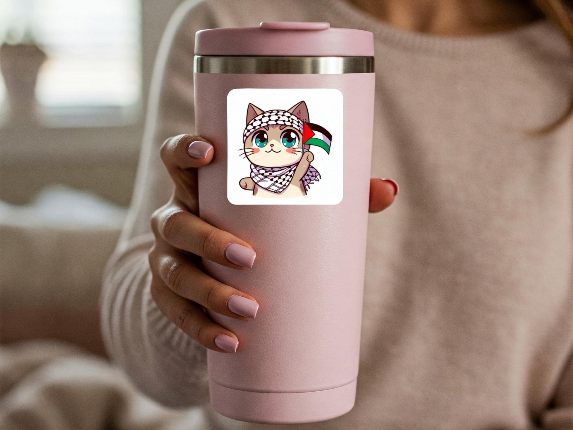 Flag of Palestine Vinyl Decal for Gaza Charities for Water Bottle Cat with Palestinian Flag and the Kuffiya Scarf Decal