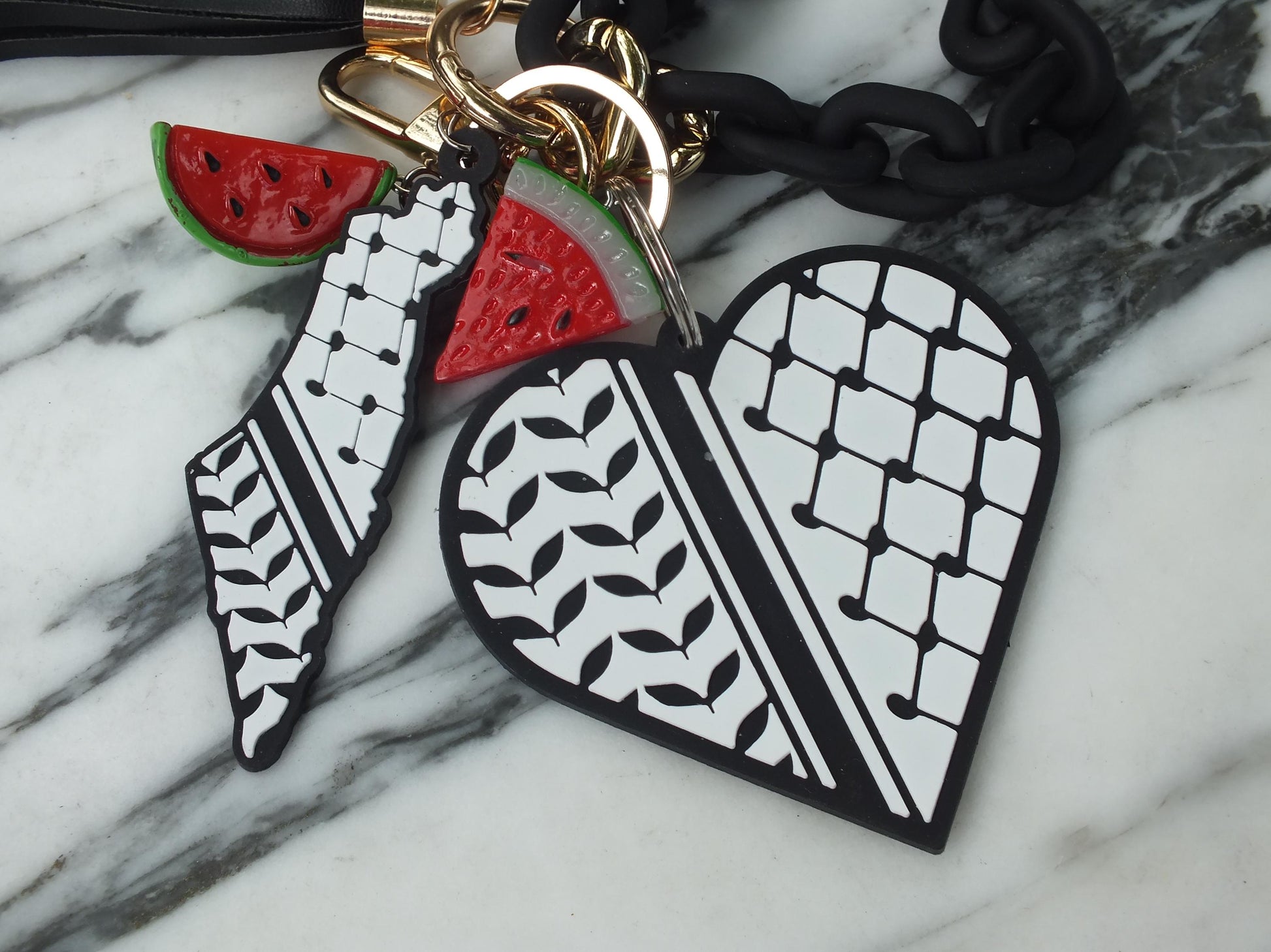 Free Palestine Keychain – Keffiyeh Heart with Watermelon Charm – Resistance Art Accessory - Cultural Activist Gift in Solidarity with Gaza