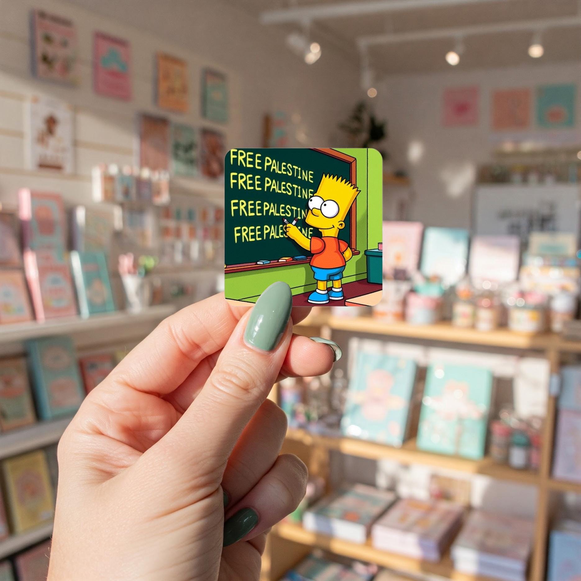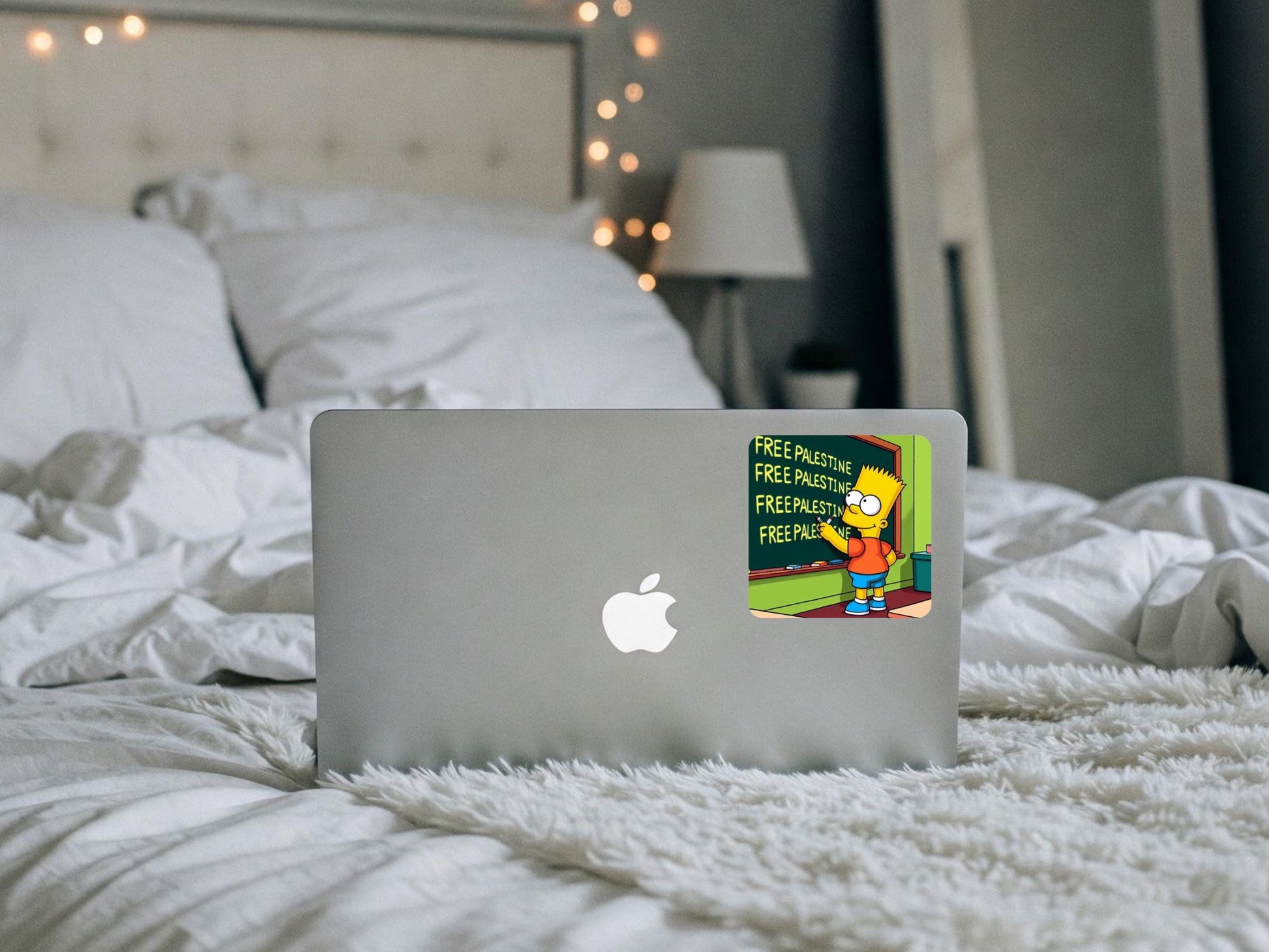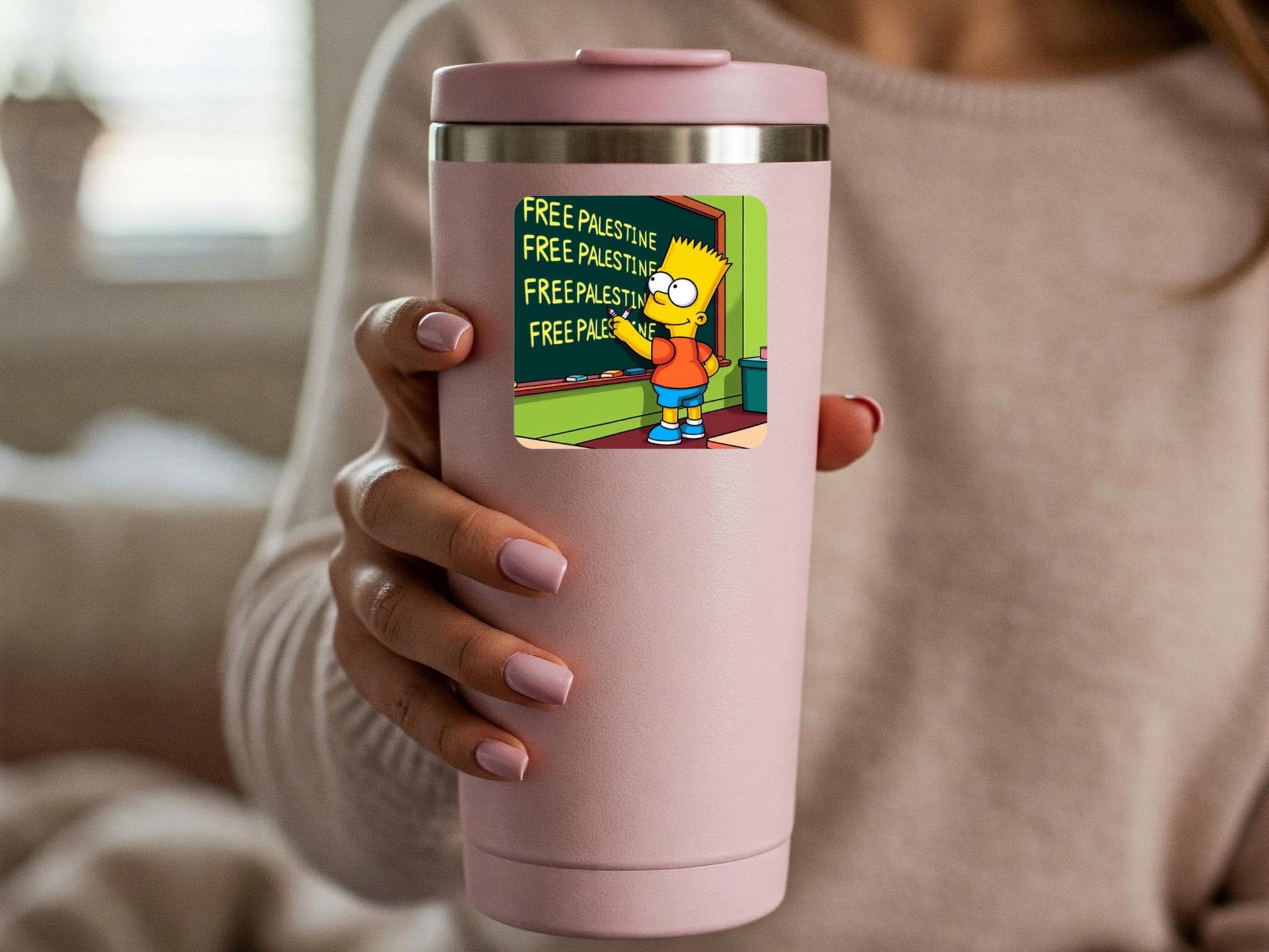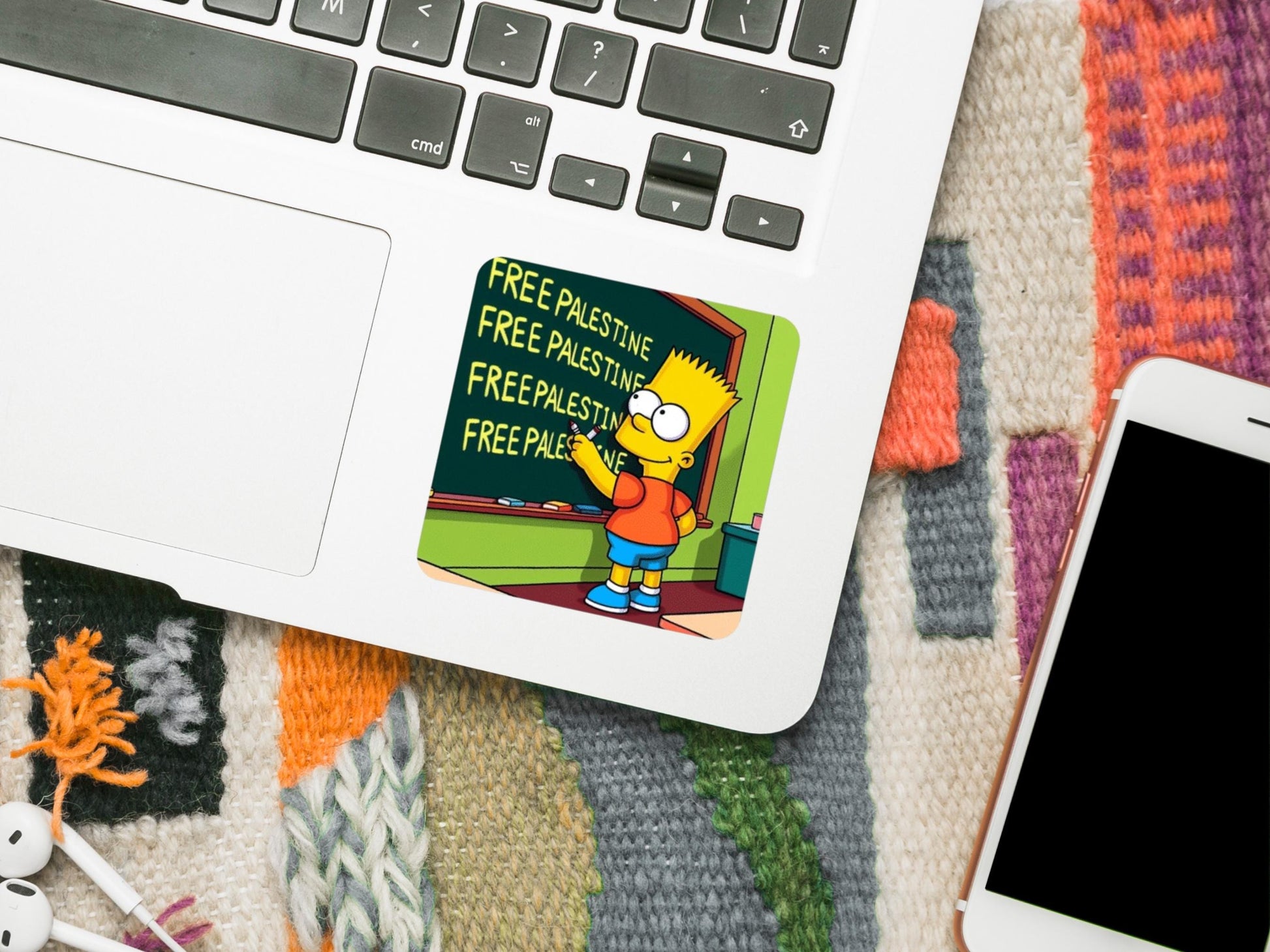 Glossy Pro Palestine Sticker for Laptop and Car Window with the Kuffiya Pattern Popular Yellow Cartoon Character with the message Free Palestine Smooth Square Rounded Corners