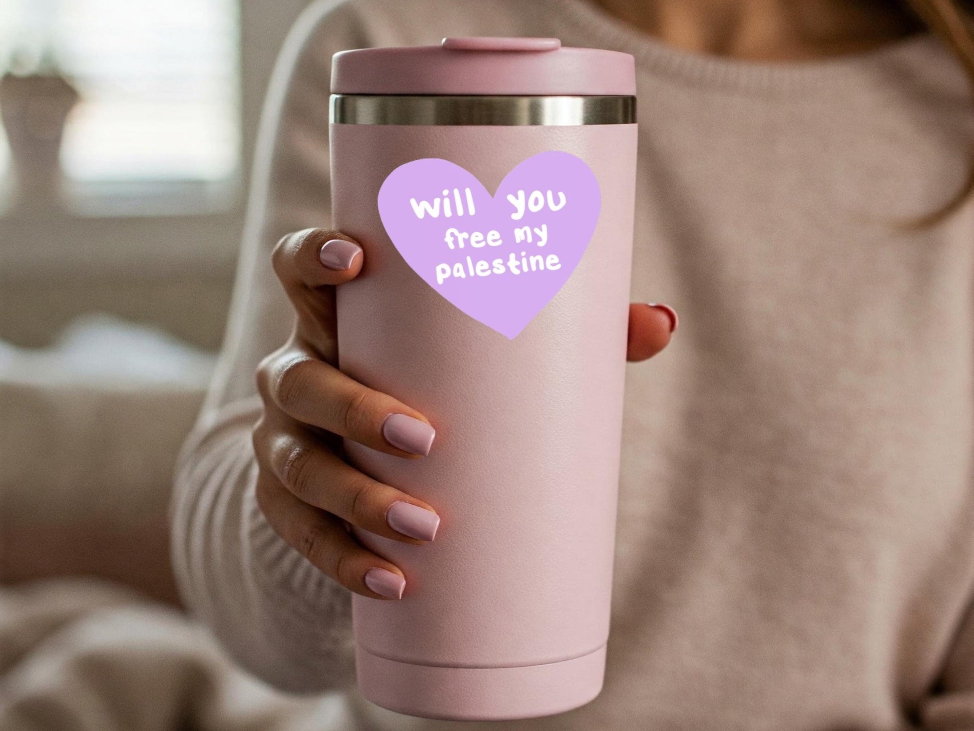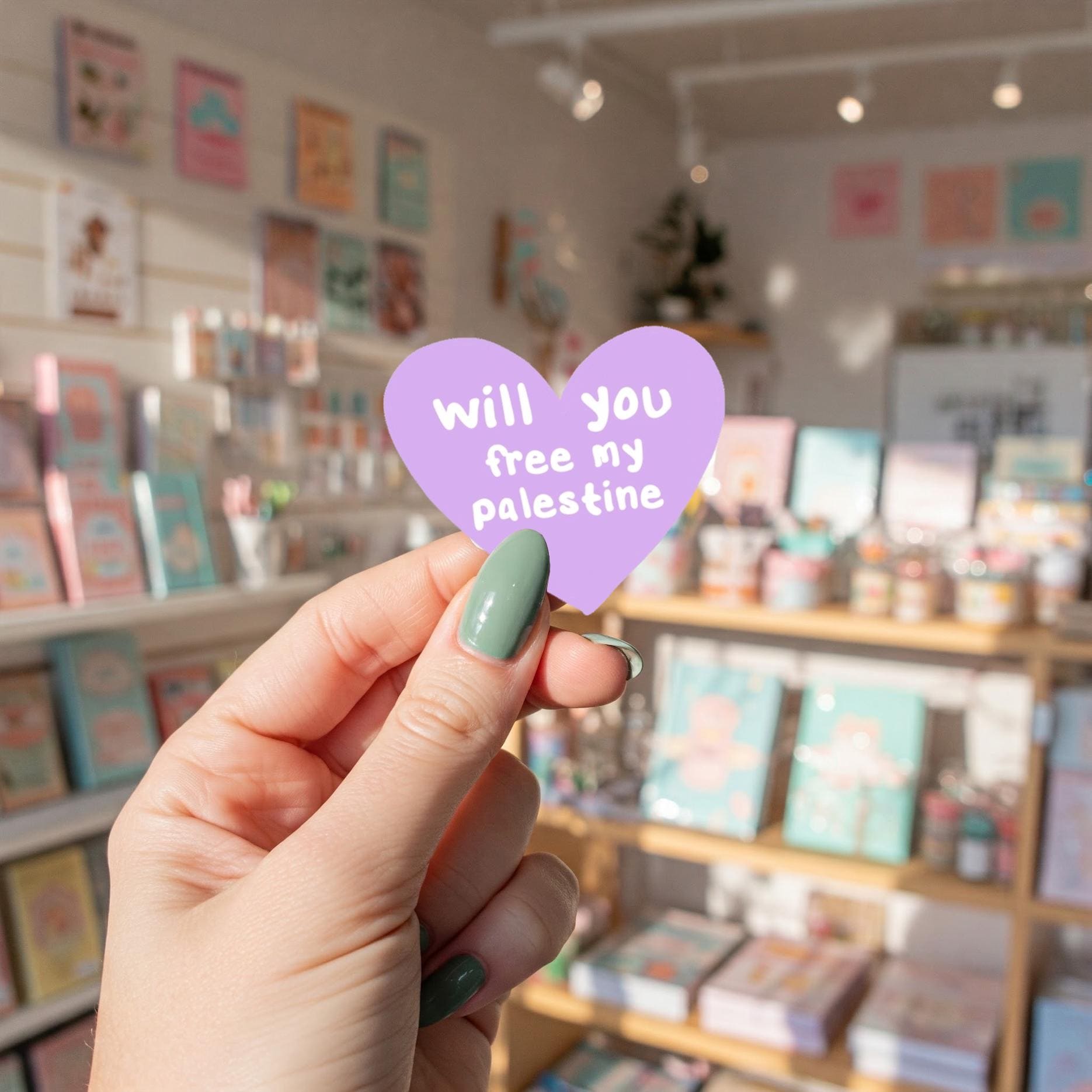 Free Palestine Sticker will you free my palestine in white on a lilac heart