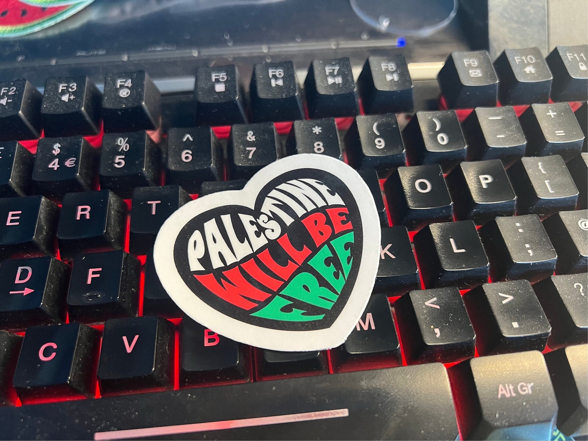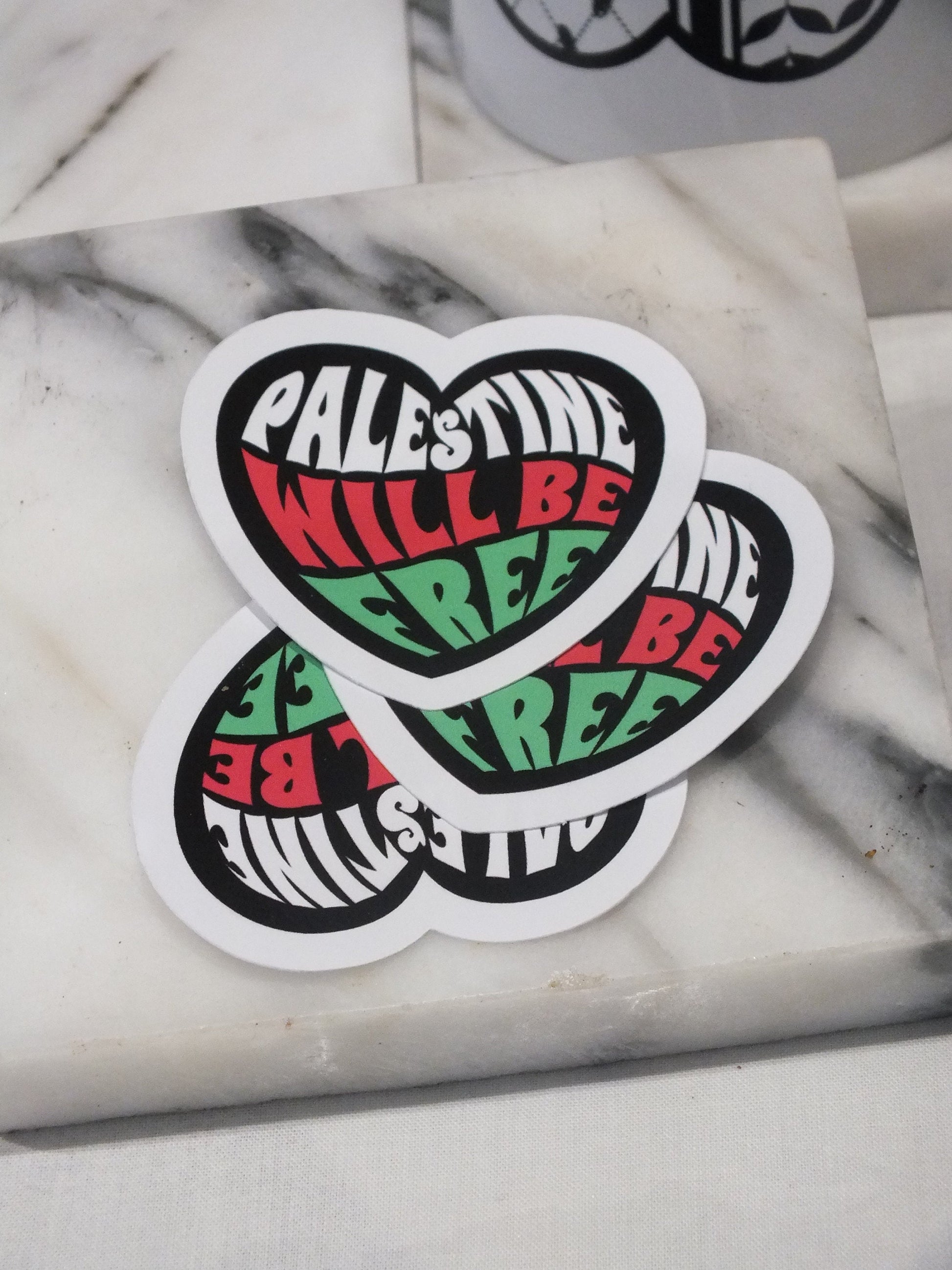 Bulk Vinyl Decals for Gaza in the shape of a heart for water bottle Palestine Will Be Free Sticker In the shape of a heart with a white outline